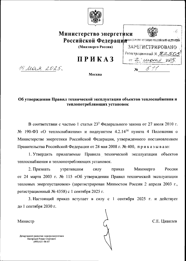Минэнерго России опубликовало новый приказ 14.05.2025 № 511 «Об утверждении Правил технической эксплуатации объектов теплоснабжения и теплопотребляющих установок».