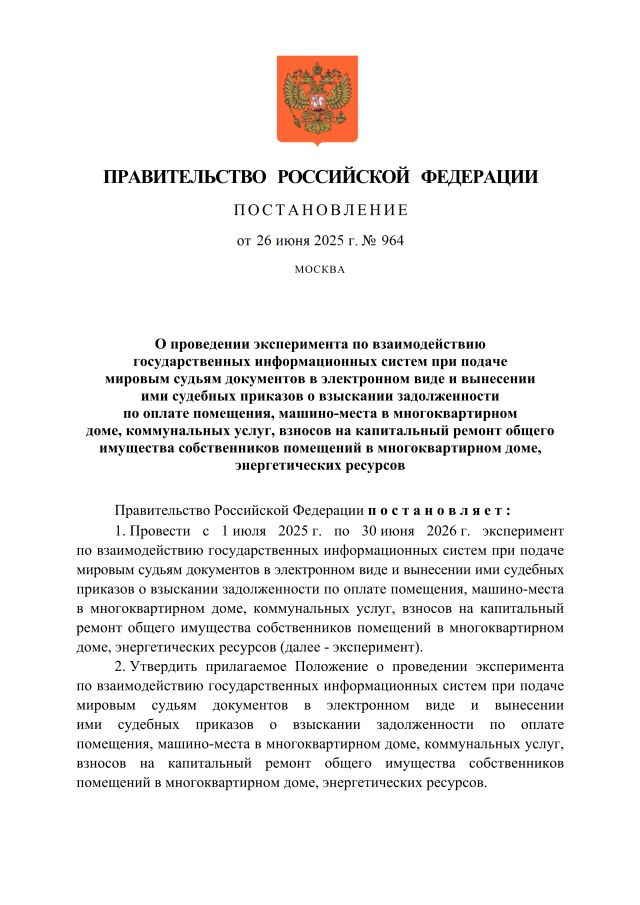 Принято постановление Правительства Российской Федерации от 26.06.2025 № 964 «О проведении эксперимента по взаимодействию государственных информационных систем при…